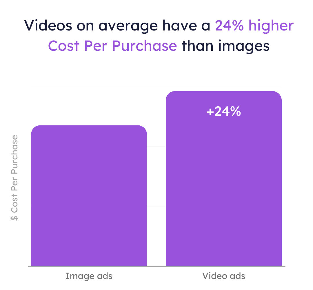 At the top of the funnel—when you’re targeting cold audiences—videos have a 26% higher cost-per-purchase than images. Makes sense, right? People don’t know you yet, they’re scrolling fast, and getting them to stop and convert takes more work.