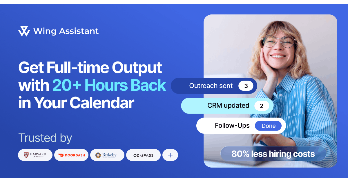 Wing gives you high-performing, trained virtual assistants to do the work that drags you from high-impact goals. They handle calendars, outreach, & ops with care so you start doing what matters. Sales, marketing, admin, finance, design - Wing has a specialist for everything. Trusted by 10K+ leaders.